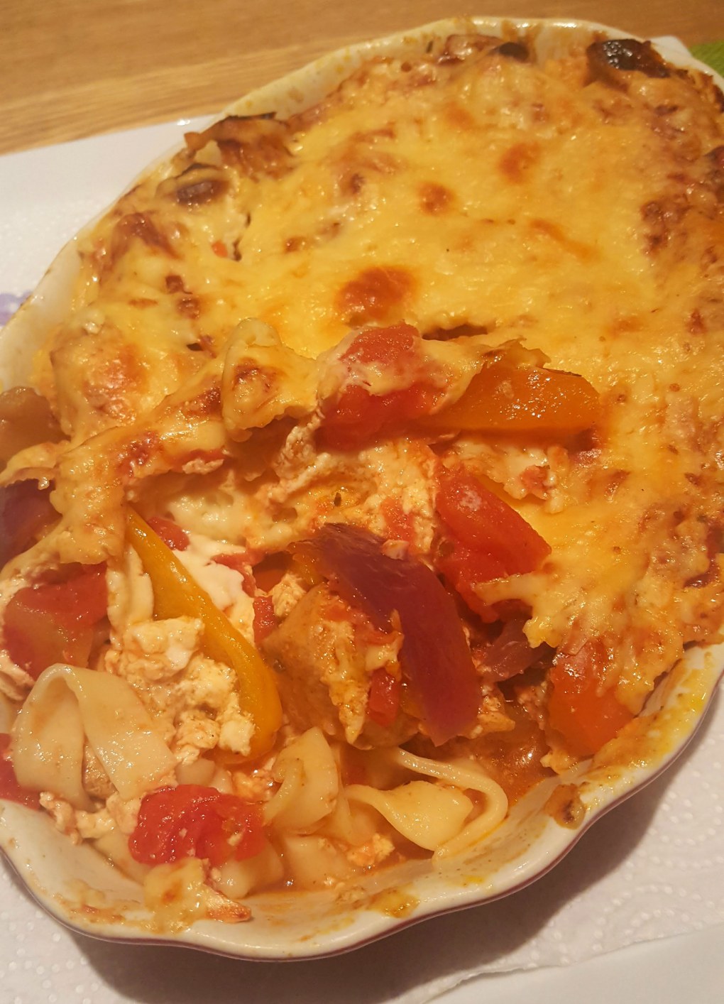 - In an oven proof dish, layer your lasagne, chicken filling first then lasagne sheets, then more filling, then lasagne sheets. Pour over your sauce mix evenly and finish with extra cheese and little sprinkle of smoked paprika. Bake in an oven for 45 minutes or until topping is browned and bubbling.
